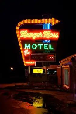 - 🌍 Munger-Moss Motel, 1336 East Route 66, ☏ +1 417 532-3111, mungermoss@earthlink.net. Vintage auto court with patio, outdoor pool, established 1946 in the heyday of US Route 66. Some individual rooms are decorated with photos on specific Route 66 themes; the huge illuminated sign was installed in the 1950s to compete with major chains then entering the market. Wi-fi, coffee. Office and Route 66 souvenir shop open 6:30AM-10PM. $42-65.