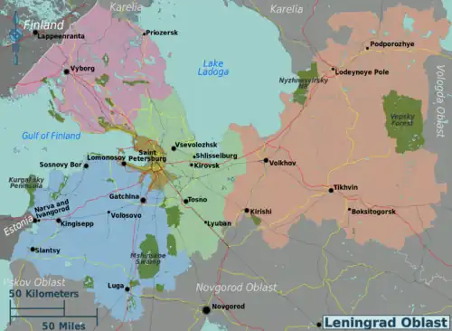 Leningrad Oblast is a region of Northwestern Russia named for the old name of its principal city, Leningrad, now known as Saint Petersburg. It borders Pskov Oblast to the southwest, Estonia and the Gulf of Finland to the west, Finland to the northwest, Karelia and Lake Ladoga to the north, Vologda Oblast to the east, and Novgorod Oblast to the south.