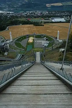 - 🌍 Lysgårdsbakkene Ski Jumping Arena. Olympiaparken. The ski jumping site for the Olympics, now a year-round attraction with a chairlift to the top (or, if you're feeling frisky, a hike up 954 steps). Visit the ski jump tower to gaze down at the K120 jumping hill and an excellent view of Lillehammer and Lake Mjøsa. Chairlift 40 kr return incl. ski jump tower admission, plus an optional 25 kr for the bobsled simulator. The site is a solid 20-30 min uphill hike from central Lillehammer, walk up Fossgatan and follow the signs for Olympiaparken/Chairlifts. Open 9AM to 8PM summer, 9AM to 5PM spring/fall, 11AM to 4PM winter.
