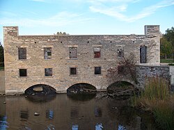 In 1825, settlers began to come to the region, and by 1827, the Purdys, an American family, built a dam on the Scugog River at the site of present-day Lindsay. The following year they built a sawmill, and in 1830, a grist mill was constructed. A small village grew up around the mills, and it was known as Purdy's Mills. In 1834, surveyor John Huston plotted the designated town site into streets and lots. During the survey, one of Huston's assistants, Mr. Lindsay, was accidentally shot in the leg and died of an infection. He was buried on the riverbank and his name and death were recorded on the surveyor's plan. The name Lindsay remained as the name of the town by government approval. Lindsay grew steadily and developed into a lumbering and farming centre.