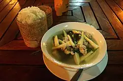 The night market is a good choice if you want to try something new after being on pad Thai and sticky rice for a while. Lao market traders are learning that Westerners readily buy their prepared meals, and so there is an option to supplement household income (when the rice paddy isn't otherwise consuming their time). The range on offer runs from soups, laab, BBQ chicken, beer, good Lao coffee, and various fruits. During daytime, the good Lao food is always on offer at the normal daytime market (opposite songthaew bus station). Fried banana with coconut, 1,000 kip; corn on the cob, 500 kip; fruit shake, 5,000 kip; noodle soup, 5,000 kip; ready-made dishes, 5,000 kip