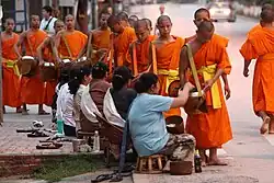 - 🌍 Alms ceremony (Sai Bat), Sisavangvong Rd. Daily 05:00-06:00. Monks at dawn collect alms of rice from kneeling villagers (and early-rising tourists). Ask your guesthouse host to assist you the day before in preparing if you'd like to get up and give alms in the morning. The alms giving ceremony is one which, while picturesque, is not without its detractors. Unscrupulous local merchants have used the eagerness of tourists to participate in this tradition as a means of making easy money. They sometimes sell unsuitable, stale and even unsafe food, resulting in monks falling ill after having consumed the offerings, Hence the growing resistance to continuing the tradition. The government, however, has made it clear that the monks must continue the custom or be replaced by lay persons clothed in saffron robes in order to keep up appearances, thereby maintaining tourist revenue. If you wish to participate in this ceremony, prepare the food or fruit yourself. Avoid giving food of dodgy quality. Another problem is the rampant photography: while a photo might look nice in your collection, think about how it must feel for the monks to have hundreds of tourists photographing them every day. Some lowlifes even stand next to the monks, blinding them with flashbulbs. Consider watching this old tradition from a distance instead of degrading it.