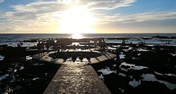 - 🌍 Zhaori Hot Springs, No. 167, Wenquan Road, ☏ +886 8 967 1133. 08:00-24:00. One of only 3 salt-water hot springs in the world with rocks surrounding them. The sea is heated by the energy from underwater volcanic activity. The hot spring consists of three open-air pools, a spa pool and five terrace-like pools, each with a different water temperature. Vendors there sell eggs and shrimps. People can boil eggs and roast shrimps. While soaking in it, visitors can listen to the sound of waves hitting the beach, watch the sunrise, sunset, and appreciate a sky full of stars. NT$100-200.