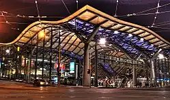 The City Loop forms the backbone of the entire Melbourne train network and serves the city. It runs around the edges of the grid layout, with a mix of sunken, elevated and underground sections. The iconic Flinders Street Station in the south serves as the hub of all suburban rail travel throughout Melbourne, while the also iconic Southern Cross Station in the west is the hub of rural and interstate rail and bus travel. Parliament, Melbourne Central and Flagstaff stations are all underground, located in the east, north-east and north-west respectively. Melbourne Central station is located beneath a major shopping centre.