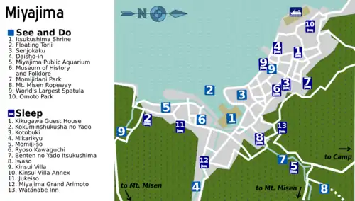 - 🌍 The cabin and tent site at Tsutsumigaura Inlet (包ヶ浦自然公園), Tsutsumigaura, Miyajima-cho (a bus travels from Miyajima Pier to the campground, 10-minute ride,; from morning until 18:00 which costs ¥300), ☏ +81 829-44-2903, fax: +81 829-44-0706, info@tsutsumigaura.com. This is a nice campsite on Tsutsumigaura Beach, about 4 km from the harbour. Cabins and outdoor grills are available. Local deer walk freely around the campsite, so don't leave food in your tent while you are away! Campsites ¥1000 per person per night.Rental tent ¥3080..