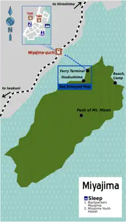 - Watanabe Inn (旅館わたなべ), 215-1 Takimachi, Miyajima-cho, ☏ +81 829-44-0234. A small inn close to Daisho-in, a nice spot as long as you don't mind a walk (about 20 minutes from the pier). Each room has a private bath made of Japanese cypress wood. The restaurant is particularly well regarded. Rooms from ¥15,750 per person (meals included).