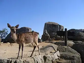 Tame deer amble around the island, harassing tourists for food (and all things paper, which they think is food). While somewhat more restrained than their counterparts in Nara, they're still eager for a hand-out. In the past, waffle-like wafers and pellets could be bought to feed them. However, a feeding ban is now in place, which has led to declining numbers — and increased boldness among the remaining deer, who are willing to root in around bags or backpacks for food (even while said bags are being worn). Further up on Mt. Misen, there are a few deer who have not had their (sharp) antlers removed, so take care if you see one.