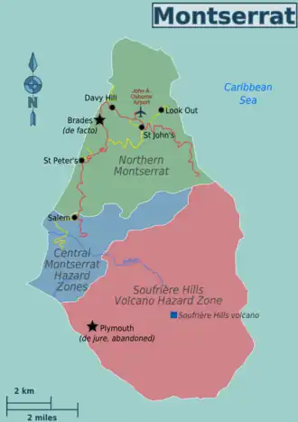 The old capital town, Plymouth, was in the south and has been destroyed or buried by volcanic eruption. While the Soufrière Hills Volcano Hazard Zone in the south is (de-facto) never publicly accessible, the level of access to Central Montserrat Hazard Zones in the centre of the island is variable, based on current volcanic activity levels.