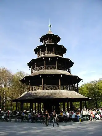 - 🌍 Chinese Tower (Chinesischer Turm) (U-Bahn U3, U6: Universität or Bus 54, 58). This 25 m high pagoda was constructed with the original park in 1790, and rebuilt after World War II in 1952. It has a beer garden, with a Bavarian oompah band performing at weekends from the second floor. It can feel touristy, and horse-drawn carriage and rickshaw tours through the garden start here - see below for the Kocherlball in summer and the Christmas Market. Until the end of 2022, the tower is scaffolded for re-roofing; the beer garden remains open. The tower is 1 km from the U-Bahn at Universität, but Bus 54 runs past it from Münchner Freiheit and Ostbahnhof S- and U-Bahn stations.