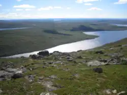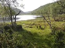 The southern part of the area is lowland dominated by fell birch, with bogs, some old pine woods and some of the fells extending above the tree line. Going to the north the terrain gets higher and even the fell birch has to seek shelter in valleys. The open rolling fell landscape of the central and north parts of the area is what most hikers come here to enjoy. The highest peak, Kuárvikozzâ, reaches a modest 590 metres, 250 metres above its surroundings.