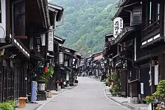 The best preserved and most popular part of the Nakasendo, the Magome-Tsumago Trail between the post towns of 🌍 Magome and 🌍 Tsumago, is in this section. The trail is typically walked in the "wrong" direction (west to east), since otherwise you're going uphill for much of the way. 🌍 Narai, once the largest and richest post-town in the Kiso Valley, is also worth a visit.