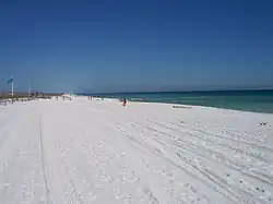Navarre Beach, with its distinctive emerald green water, earning it the nickname of the Emerald Coast. This is the narrow strip of land in the sea across the causeway. Navarre's enormous stretch of beach is spectacular, with some of the most beautiful white sand beaches in the world. See the 'Do' section and 'Beaches' sub-section for the most prominent beach access points.