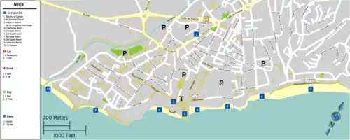 Nerja (pronounced like: N'air'-ha) is a seaside resort on the Costa del Sol, in the region of Andalucia of Spain. It is one of the few resort towns on Costa del Sol that isn't dominated by large ugly concrete hotels. It's in the attractive foothills of the Sierra Almijara mountains.