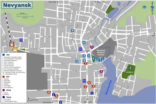 - 🌍 Nevyansk History and Architecture Museum (Невьянский историко-архитектурный музей), 2 Revolyutsii Sq (пл. Революции, 2), ☏ +7 (34356) 2-43-99, +7 (34356) 2-20-56 (guided tours), priem@museum-nev.ru. Tu-F 08:00-17:00, Sa Su 09:00-17:00 (May-Sept 09:00-19:00). The collection of this museum is split between two buildings: the former power plant behind the Leaning Tower, and a small house on Revolyutsii Square. The latter also has a small, though free, outdoor exhibition of local products. The cornerstone of this collection consists of dried herbs native to the area as well as stuffed animals, but also includes some more interesting regional specialties such as Nevyansk icons, artifacts from the peat bog of Shigir, and iron castings from Casli. Since similar (and more interesting) items are on display in Ekaterinburg, the museum merits a visit mainly as a way to pass the time before a visit to the tower. Entrance fee: 60+40 rubles for the two museums (2012).