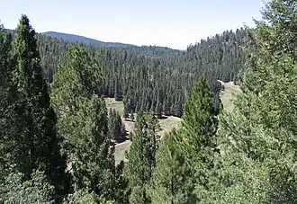 In 2000, Los Alamos was devastated by the Cerro Grande wildfire. Several of the orienteering venues here are affected by the wildfire, and subsequent drought and bark beetle outbreaks. Happily, as of 2010 most of the killed trees have fallen, and fallen trees and standing hazard trees have been cleared from trails. New growth is everywhere, mule deer are abundant, and some valleys have magnificent wildflower shows in summer and fall.