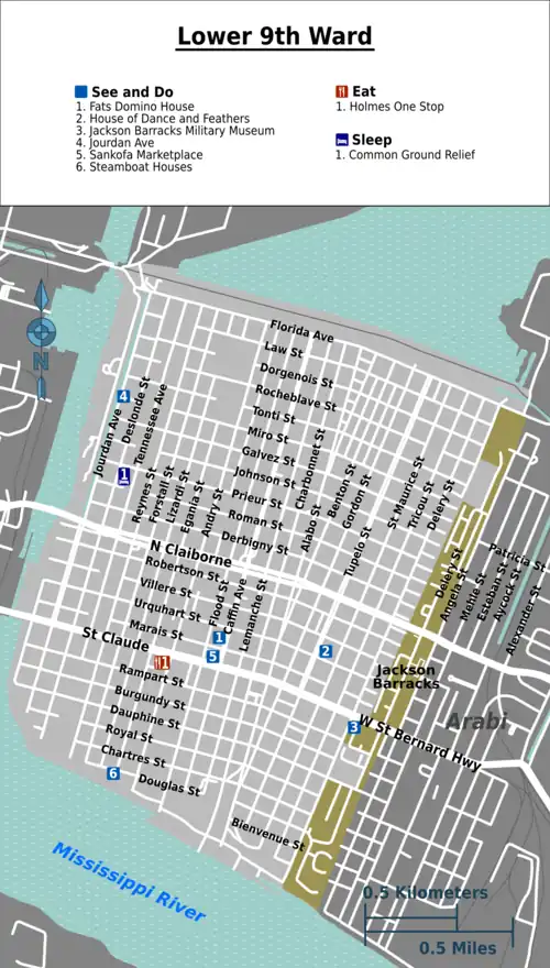 - 🌍 Jackson Barracks Military Museum, 6400 St Claude Ave, ☏ +1 504 278-8242. M-Sa 10AM-4PM. Jackson Barracks military base has been here since the 1830s. This is an unorthodox choice for most Lower 9th visitors, but the Louisiana National Guard has an interesting military museum, with artifacts, weapons and memorabilia from every major American war. Free.