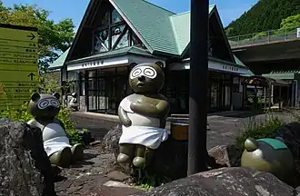 Awakura Onsen (あわくら温泉) is said to have been discovered by a tanuki (raccoon dog). According to legend, a tanuki was shot by a hunter in the mountains. He hobbled down the valley towards the river. A few days went by until he was spotted again walking back up the mountain without injury, as if nothing had happened to him. When the people saw this, they followed the river to the place where they saw the tanuki go and discovered a spring of hot water bubbling up from the ground. This is said to be the origin of Awakura Onsen. That is why you'll see tanuki statues outside Awakura Onsen Station, tanuki on the town's manhole covers, and other tanuki motifs around the onsen area.