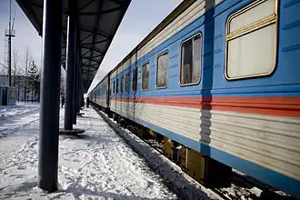 - Nogliki Railway station (Ноглики вокзал) 613 kilometers north of Yuzhno-Sakhalinsk has a daily nighttrain arriving from Yuzhno at 10:45, returning south again at 18:20, the journey takes just over 13 hours, and stops in Tymovsk on the way for bus connections to Alexandrovsk-Sakhalinsky. A 6-wheeled bus connects with the train to take you 250 km up a grueling dirt road to Okha in the far north of the island.