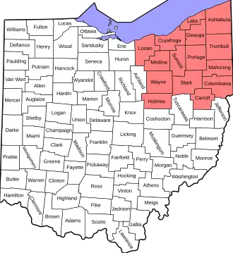 Ashland County, Ashtabula County, Columbiana County, Cuyahoga County, Erie County, Geauga County, Holmes County, Huron County, Lake County, Lorain County, Mahoning County, Medina County, Portage County, Richland County, Stark County, Summit County, Trumbull County, Tuscarawas County, Wayne County