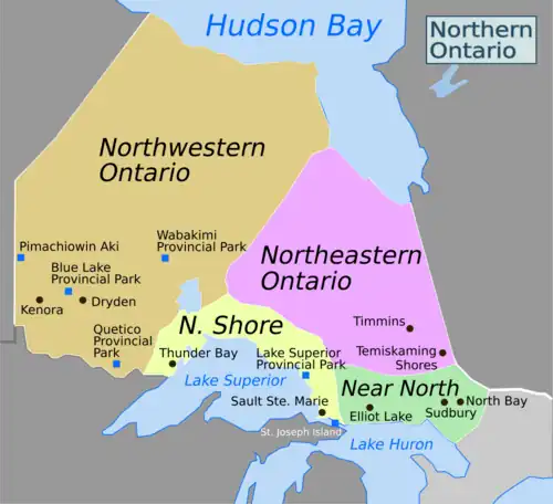 Northern Ontario has nine cities (Greater Sudbury, Thunder Bay, Sault Ste. Marie, North Bay, Timmins, Kenora, Elliot Lake, Temiskaming Shores, Dryden) and many small towns.