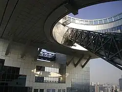 - The Umeda Sky Building is a weirdly shaped building with an observation deck and an escalator suspended between two buildings mid-air. It is near the Osaka station.