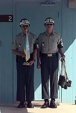 - 🌍 North Korea Peace Museum (500 m north of the JSA). The building where the armistice agreement was signed. The actual documents are kept here, guarded over by a tattered, faded UN flag and a miraculously well-preserved DPRK flag. The axe of "Axe Murder Incident" fame is also stored here. Accessible from the North only.