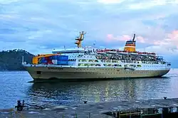 PELNI boats KM. Sinabung from Surabaya stop at Jayapura, Sorong, Manokwari and Biak. This is a relaxing and interesting way to arrive if you have the time. PELNI provides a 3-class service, consisting roughly of economy, second class, and first class. Economy class lodging and service provides for a 2.5 x 7ft bed arranged side by side with other beds and comes with minimal meals and sanitary facilities (public bathroom). The second class service consists of a 4-bed room with basic meal services and a small private bathroom. First class service is nearly identical to second class, except that the room features a 2-bed room and a window for a view outside.