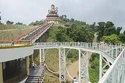 - 🌍 Chenrezig statue and skywalk. The 42-metre-high statue of Chenrezig dominates the Pelling skyline. Chenrezig, also known as Avalokitesvara, “One who looks with unwavering eye,” is the most revered of all Bodhisattvas, embodying the compassion of all Buddhas. The Dalai Lama is said to be the incarnation of Chenrezig (Avalokitesvara). The flight of stairs lead to the pedestal of the gigantic statue housing a small shrine. The pedestal houses a shrine, centered around another statue of Chenrezig (Avalokitesvara). This statues with 11 heads is the most common manifestation of the 108 different forms of Chenrezig (Avalokitesvara). The inner walls of the shrine contains bright coloured fresco depicting the life of Lord Buddha. A ramp spirals along the inner walls of the shrine and leads to an open terrace offering breathtaking birds eye view of the Pelling town, crowned with the eternal snows of Mt Kanchenjunga. The skywalk, although is more famous, is not the primary purpose of this project. It is just an additional attraction to the gigantic statue. Photography inside the shrine is prohibited. ₹50 (₹20 for Sikkimese) for sky walk only. Visit to the Chenrezig statue is free.