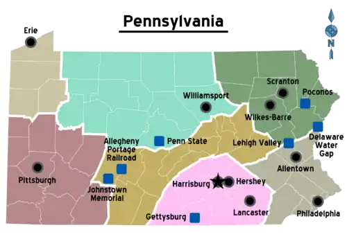 Pennsylvania is a state in the eastern United States. It is known for its Revolutionary War-era historical sites like Valley Forge, its large cities like Philadelphia and Pittsburgh, its farming regions (some occupied by the Amish), and a (once)-strong industrial history. With equally large swaths of cities and towns as fields and mountains, Pennsylvania is a rich and varied state, as well as a worthy travel destination.