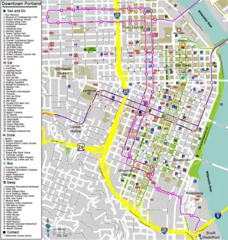 | Southwest Portland Downtown is here, with skyscrapers and many of its "splurge" hotels and restaurants. To the west is the large Washington Park with memorials, gardens and a zoo. |