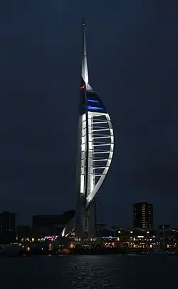 - 🌍 Spinnaker Tower, Gunwharf Quays, ☏ +44 23 9285-7520. Daily 10AM-6PM (until 10PM Sa and every day during Jul and Aug). This striking and highly visible £21-million landmark tower rises some 170 m above the redeveloping harbour of Portsmouth, symbolising the wind filling a spinnaker sail. Visitors can use the tower to view from 3 levels: at 100 m, 105 m and 115 m. A high-speed internal lift takes you to the top. Adult £7, child £5.50, concessions £6.20.