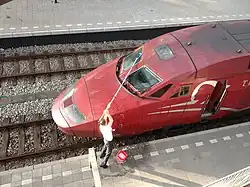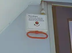 Crime on trains - aside from occasional pickpocketing and "misplaced" luggage - is rare but should you feel threatened or harassed, talk to a conductor if you can find one - not all trains are staffed with more than just one conductor. Sadly enough, the conductor is more often the target of harassment than a traveller, often for simply doing his job. Treat railway staff with the same respect you'd have for a policeman. If no conductor is to be found, look around. Often you will either find an 0800- phone number on stickers in your wagon or find a noodtelefoon (emergency phone), labelled with SOS either at a central location of your wagon, or at the wagon's balcony. Call this number or press the button to talk to the operator's staff that will help you out as well as inform the appropriate emergency services. Do not use the emergency brake unless you've been told to by staff, which, even in the case that it is necessary, is very unlikely. Using the emergency brake locks the train for some time, stopping it from continuing on the tracks. By engaging the brake you're not only making life-threatening situations worse by making it more difficult for emergency service to reach the train, you're also making many people very mad by causing a delay on their daily route. Also, misuse of the emergency brake (Noodrem) is often severely punished, most often in the form of a large fine. No matter the severity of the situation, the Noodrem may never be used in a tunnel.