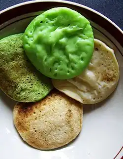 A well-known type of food from Rengasdengklok is serabi hijau. Serabi is a pancake that is made from rice flour with coconut milk, that is made throughout Java. However, the serabi from Rengasdengklok is special because it is green ('hijau'), using the leaves of a type of dracaena plant (daun suji).
