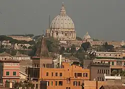 - π Parco Savello (from the Bocca della VeritΓ church (S.M. in Cosmedin) take the Via della Greca a short distance towards the Circus Maximus; then take the Clivo dei Publicii, the first road off to the right, which climbs and curves into the Aventine hill; the park is on the right). Parco Savello is the name of the grounds and orange grove next to the Santa Sabina church at the top of the Aventino and also where you have one of the best views of the city. Families gather here to sit under the dozens of orange trees. The "Giardino degli Aranci" is also a well known spot for lovers at night. The best views are arguably from Janiculum hill, just across the Tevere (Tiber) river. Immediately below you, the Tiber snakes its way through the city, and directly beyond it you can see the lively medieval quarter of Trastevere. Beyond that is the majestic dome of St. Peter's Basilica, with the historic centre of Rome visible to the right.