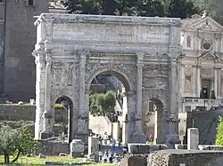 - π Arch of Septimius Severus (Arco di Settimio Severo). Erected in 203. You can see it close up from Via della Curia also (without entering the Forum).