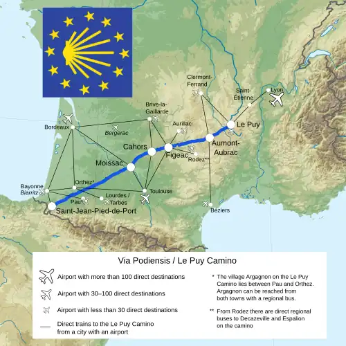 The Via Podiensis starts in Le Puy-en-Velay in Haute-Loire and passes through Conques, Cahors and Moissac on the way to Saint-Jean-Pied-de-Port. It is part of GR 65.