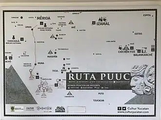 La Ruta Puuc is an official name given to a 41 km network of secondary roads through Yucatán state along which one can tour Mexico's Mayan Puuc cultural heritage. The route is marked with signs. Important sites on the route include Uxmal, Kabah, and Labna. Puuc is the Mayan word for "hills", and the Puuc region of the Yucatan is area of small rolling hills on a peninsula which is otherwise quite flat. Some travellers spend several days visiting all the sites along this route.