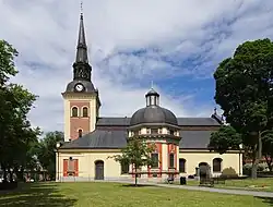 Sankta Ragnhilds Kyrka (English: Church of Ragnhild of Tälje) from the 1100s-1300s. It is the main church in Södertälje parish in the Diocese of Strängnäs. After many renovations, the church is today a large building with three arches. The oldest parts consist of grey brick walls that comprise the lower parts of the bell tower and the two westernmost compartments of the longhouse. Renovations were made after the city fire in 1650. Further additions were made in the 1670s, when the Cronberg-Hackerska choir in the middle of the southern wall. It was probably designed by Erik Dahlbergh, and is now used as a baptismal chapel. During the fires during the Russian Pillage of 1719–21, it was one of few buildings that survived. A major restoration under the direction of architect B. Romare took place between 1960 and 1961. A few years after this, two of the windows next to the baptismal chapel received new stained glass windows by F. Heybrock. The exterior of the church was repaired in 1986 - 87, with the facades partially receiving their current colour scheme.