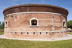 - π Massimiliana tower. The Massimiliana tower is a circular plan structure built between 1843 and 1844 on the extreme southern tip of the island of Sant'Erasmo, above the foundations of an earlier French fort. Surrounded by a moat and an irregular polygonal bank, it was placed in defense of the port mouth of Lido. It was built on the order the Archduke Maximilian of Austria. It is the only example of this type of tower still existing in Italy. It was used during the Second World War as an anti-aircraft battery, and occupied by German troops in 1943. In April 1945 the retreating Germans seriously damaged it in an attempt to blow it up. It was used in the post-war period as a precarious housing by the displaced, and later used as an agricultural warehouse. In the late 1990s, it fell into a state of total abandonment. It was restored in 2004, and hosts art and photography exhibitions and cultural events.