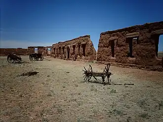 Three interesting sites are near the town of Larned southwest of Great Bend. A Trail visitor center west of town (1349 K-156 Hwy, ☏ +1 620 285-2054) contains a regional-class museum with some outside exhibits; open daily 9AM-5PM (closed Mondays during the off season, and also on major holidays), $4 for adults, $2.50 for students, $1.50 for children 6-11. About 4 miles beyond this site on K-156 is Fort Larned National Historic Site, a unit of the national park system that preserves a major military outpost along the Trail. Fort Larned is not one of the earlier Trail sites, dating only to 1860 when it was established to protect the increasing flow of Trail commerce from Indian raids, but it's particularly well preserved, with some original buildings, and well worth an hour or two; open daily 8:30AM-4:30PM. Finally, although authentic Trail ruts are hard to find in this agricultural area, a short, well-preserved set of ruts is southwest of Fort Larned on "190th Street," really a country road amid the farms. The exceptionally friendly and helpful rangers at Fort Larned can give you a map to this site, which has a short trail (through a prairie-dog town) to a viewing platform from which the ruts can be seen; go late in the daytime for best viewing, as shadows help bring definition to the ruts.