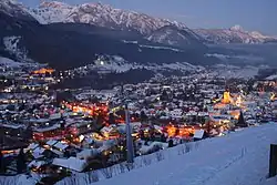 Schladming is a small former mining town in the Enns valley of Styria (Austria), that is now a very popular large winter sports resort. It has a great view on the Dachstein mountains.