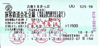 The Seishun 18 Ticket (青春18きっぷ Seishun jūhachi kippu) is a discount rail ticket offered by Japan's JR network. When available (three times a year, on 136 days in total), it is an affordable way to get around Japan, costing ¥12,050 for five consecutive days of unlimited travel – but only on local and rapid trains (no limited express or Shinkansen lines). There is also a three-day variant available for ¥10,000. Despite its name meaning "Youth 18", anyone can purchase the ticket, regardless of age, student status, residence status, or nationality.
