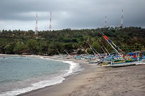 - Mangsit — a little to the north of Senggigi township, it has a well established hotel strip running along a long tranquil sweeping beach with traditional outrigger boats resting on the sand. Mangsit is the gateway to the northern area of activities at Gili Islands, Tanjung and Mount Rinjani. It has well established resort hotel choices but few other tourist activities, such as shopping and nightlife. Mangsit can be quickly and conveniently reached from the centre of Senggigi by taxi or public bemo.