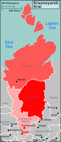 Krasnoyarsk Krai (Красноя́рский край) is a vast, sparsely populated region in Siberia about three and a half times the size of Ukraine, comprising 13% of Russia's territory.