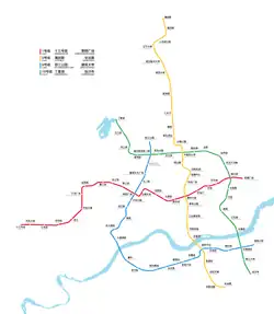 The Shenyang Metro has three lines. Line 1 runs east-west across the city (serving Shenyang rail station). Line 2 runs north-south (serving Shenyang North rail station). Line 9 runs in an L shape, from northwest to southwest to southeast. Line 10 runs in an L shape, from northwest to southwest to southeast.