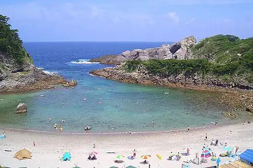 - 🌍 Ashitsuki Onsen (足付温泉) (just west of Matsugashita Miyabiyu). 24 hr. This outdoor hot spring has fairly clear water, but water temperature varies with the tide. At times it can be only lukewarm, in which case Matsugashita Miyabiyu is a good alternative. There is a change room nearby, and bathing suits are required. Free.