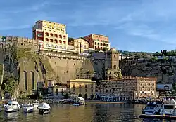 Sorrento is in Campania. The town features beautiful architecture, many cafes and restaurants, and shops catering to tourists.