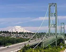 The Tacoma Narrows Bridge, backdropped by Mount Rainier.