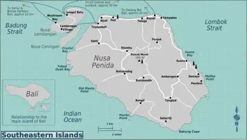 These three islands sit some 15 km (9.3 mi) off the southeastern coast of Bali. The Badung Strait separates the islands from Bali. All three feature white sand beaches and wonderfully crystal clear waters.