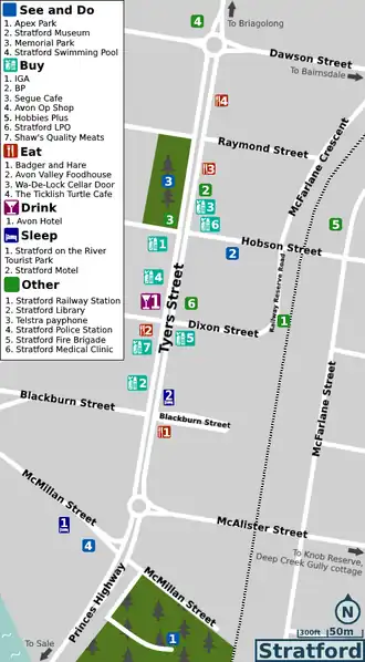 Apart from usual travel precautions, there are no significant safety concerns in Stratford. The 🌍 Stratford Police Station is at 89 Tyers St (☏ +61 3 5145 6404) and the 🌍 Stratford Fire Brigade is at 51 McFarlane St (☏ +61 3 5149 1000). 🌍 Stratford Medical Centre is available for general medical concerns, and also has a pharmacy. The nearest hospital is in Sale.